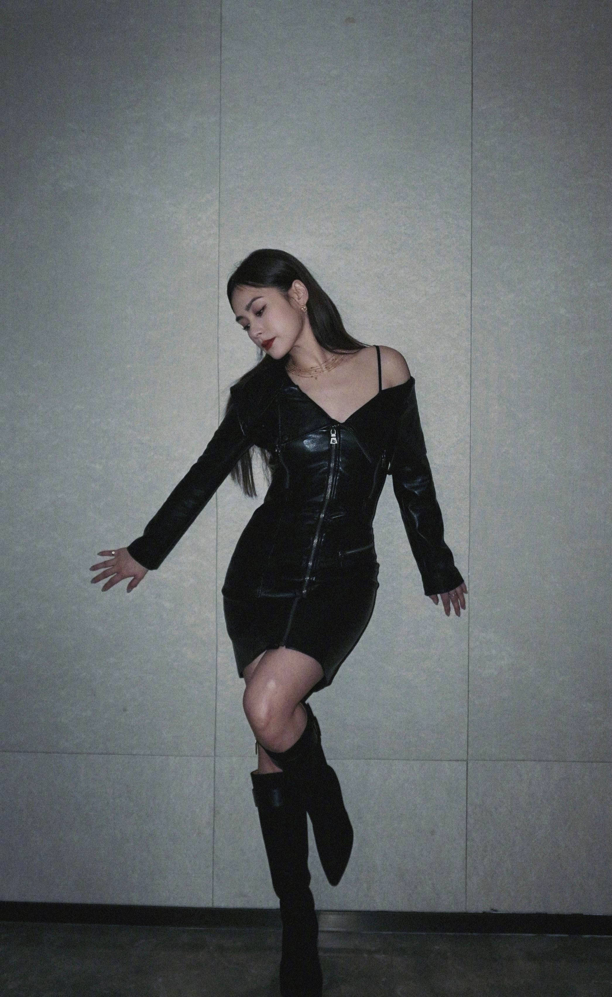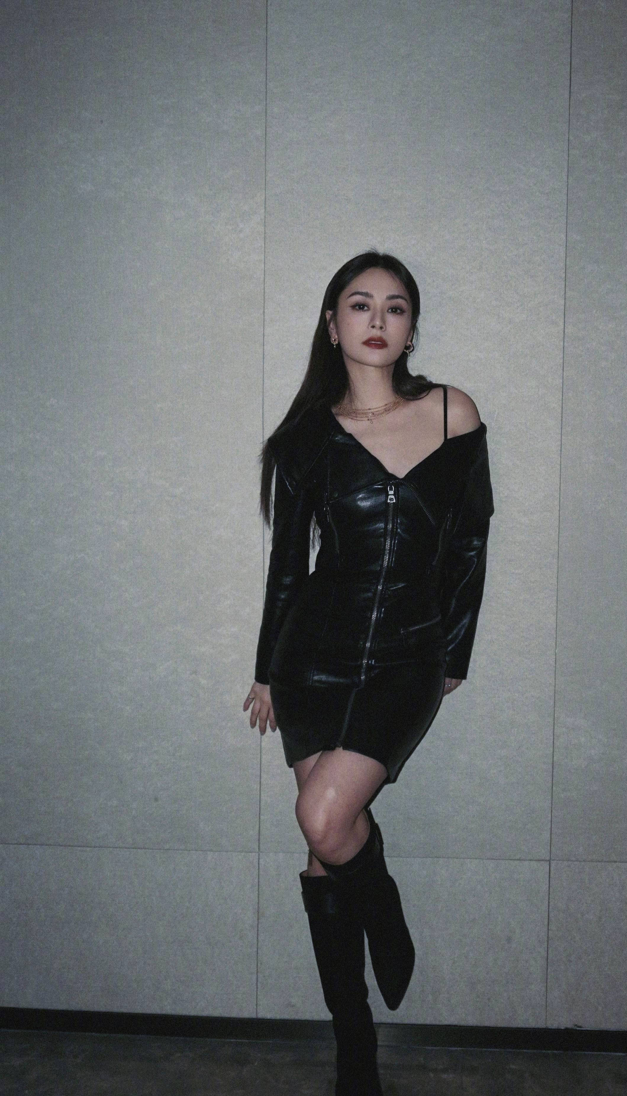 #钟欣桐 钟欣桐穿黑色露肩皮裙